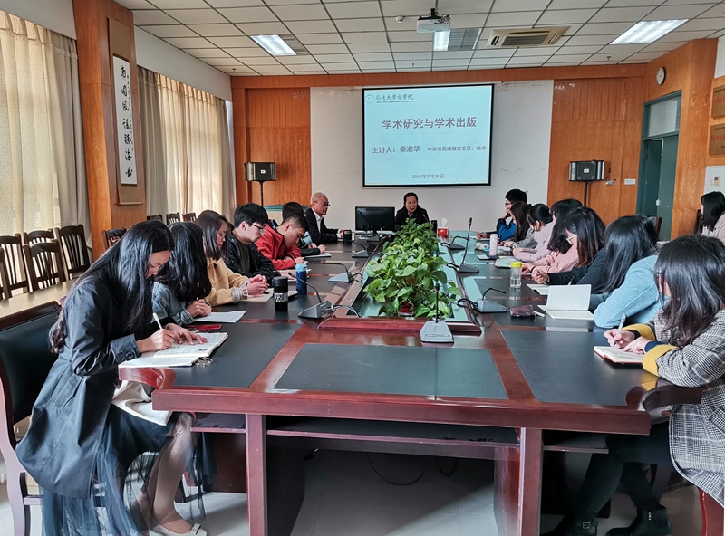 在3月29下午的中国语言文学学科建设座谈会上,秦淑华编审与学科带头人周建忠教授、文学院院长钱荣贵教授、文学院党委书记蒋国宏教授等就课题研究、项目申报等工作进行了深入的沟通,就部分学术著作的出版达成了合作意向。在3月30日上午的汉语言文字学专业建设座谈会上,秦淑华编审就历代汉语辞书的整理和研究问题发表了专题报告,与师生进行了广泛的交流,对研究生的论文写作进行了具体的指导。