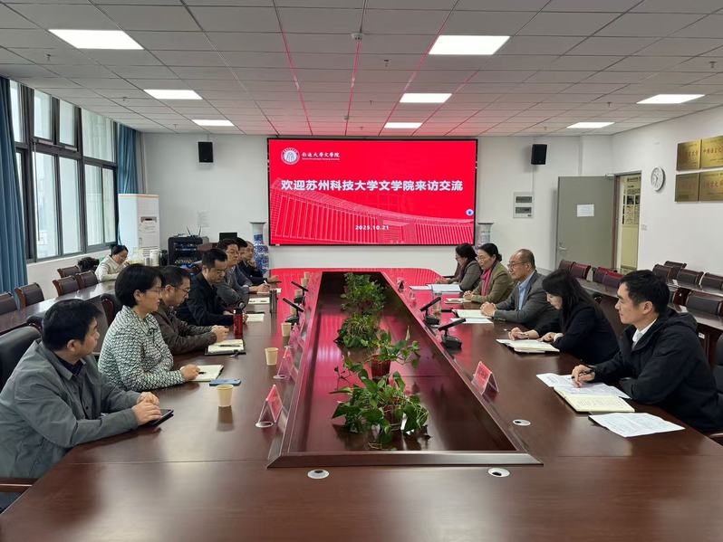 10月21日上午,苏州科技大学文学院党委书记季海君一行来我院交流。学院院长顾金春代表学院向到访的领导和老师表示热烈欢迎后,围绕学院历史、学院概况、人才培养以及“十五五”规划等方面,系统介绍了学院的整体情况。学院党委书记陈燕从筑牢根基、压实责任、凝聚合力、强化监督四个维度,系统阐述了学院领导班子建设的建设成效,分享了特色做法。她表示,期待两院以此次交流为起点,双方能够在党建创新、学科建设、专业优化等领域开展深度合作,共同探索文科教育改革创新路径,实现优势互补与协同发展。学院副院长陈树萍重点介绍了学院在推动教师科研发展、加强科研平台建设方面的具体举措与未来规划。季海君对学院的热情接待表示感谢。他希望以此次交流为契机,进一步拓展合作空间,建立长效沟通机制,共促事业发展。会上,双方还围绕课程改革、硕士点建设、学科发展等议题进行了深入的交流与研讨。学院领导班子参加交流。(胡淑英/文 顾寒阳/图)